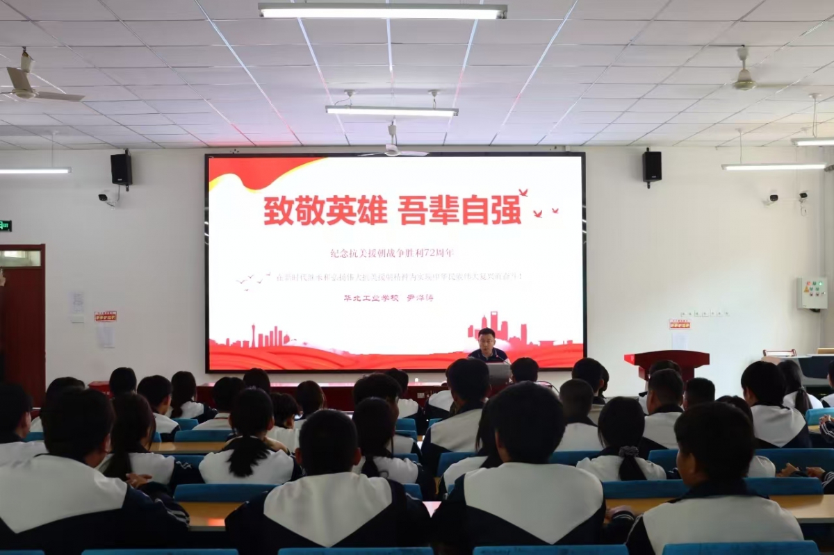 “抗美援朝战争,是在敌我力量悬殊的背景下,中国人民为捍卫和平、反抗侵略而进行的正义之战。”尹烨涛以《致敬英雄 吾辈自强——纪念抗美援朝战争胜利72周年》为题,用鲜活的数字、珍贵的历史故事,带领学生穿越时空,以史育人、以情感人,感悟抗美援朝战争中革命先辈们的钢铁意志与家国情怀,引导学生传承英雄精神,勇担时代使命,为青年学子们注入强大的精神力量。